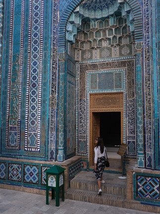 Shah-i-Zinda is also known as the street cemetery or avenue of mausoleums. The site consists of tombs inside intricately decorated buildings with domes. Many pictures of Samarkand are often taken here, which is why it can come as a surprise that people are basically posting photos of a cemetery. Shah-i-Zinda means "Tomb of the living King" and has the grave of 7th century Qusam, the cousin of the prophet Mohammed. The colours and details of the tiles are stunning, we had to make sure to stop and look up every now and then to really appreciate and take in the beauty of the site.